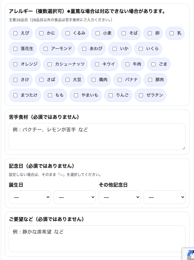 - 主要28品目の中にないアレルギーは、苦手食材の欄にご入力ください。