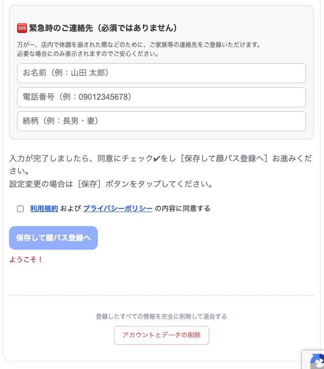 入力が完了しましたら、利用規約をお読みのうえ、同意にチェックをして[顔パス登録]にお進みください。