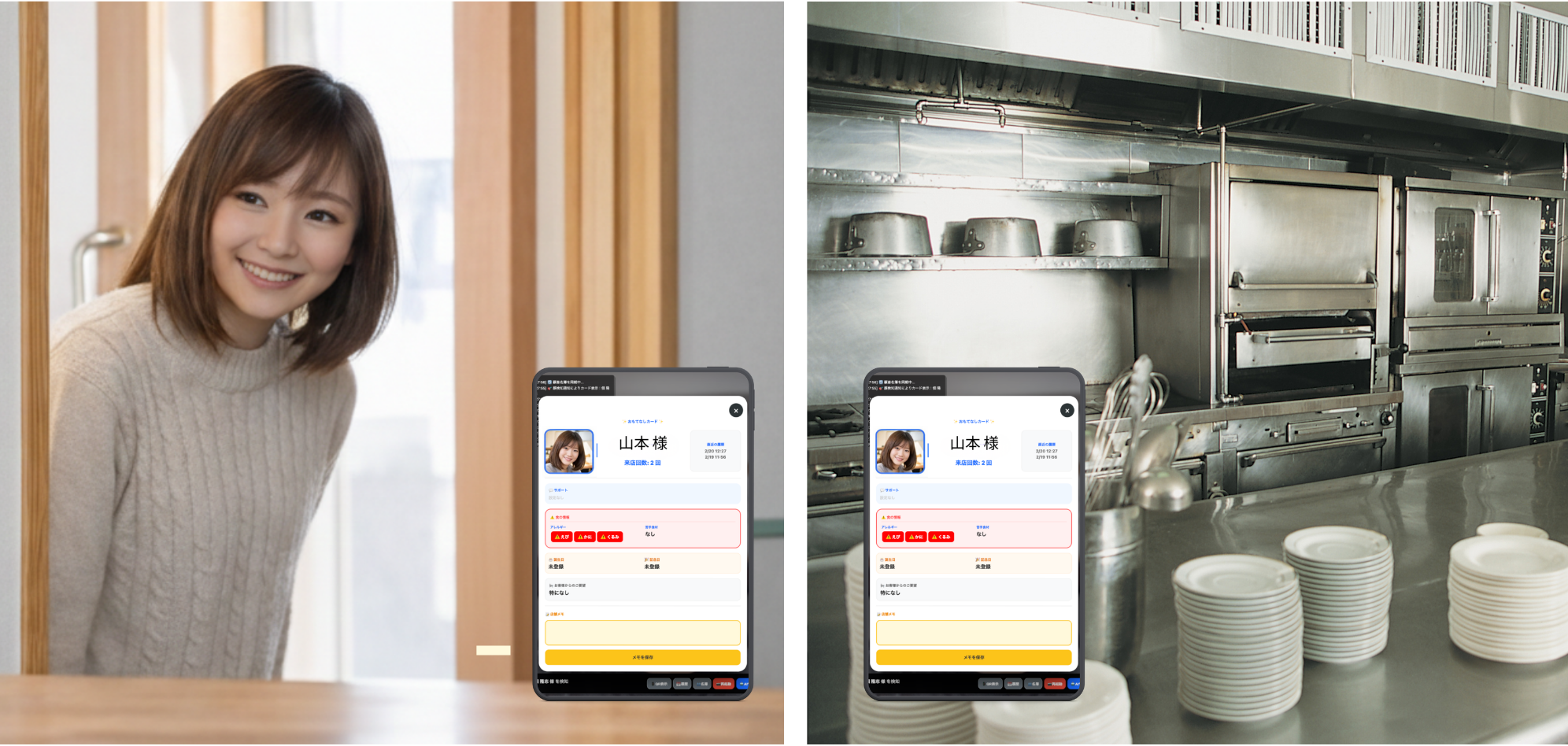 タブレットを玄関やレジに設置して、お顔の検知・おもてなしカードの表示を1台で完結します。